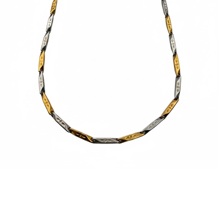 Collana unisex in acciaio inox , caratterizzata da eleganti maglie alternate oro e argento con dettagli incisi. Un accessorio moderno e versatile, perfetto per completare qualsiasi look.