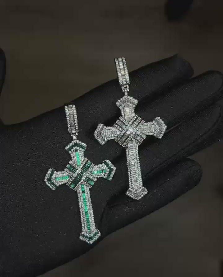 La Croce Diamond Cross è realizzata con zirconi taglio baguette di manifattura impeccabile, montati con precisione per garantire massima brillantezza. Disponibile in finitura argentata e in argentato con venature verdi, viene fornita con catena da 4 mm di spessore, solida ed elegante.